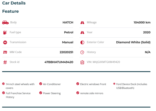 Discover the reliable and efficient 2020 Ford Figo Hatch 1.5 Ambiente, a practical choice for urban commuters and small families. This compact hatchback is powered by a 1.5-litre i3 petrol engine, delivering 88 kW and 150 Nm of torque, ensuring a smooth and responsive drive for everyday needs. With an average fuel consumption of 5.7 l/100km, you can enjoy an impressive range of up to 737 km on a single tank, making it an economical option for both city driving and longer journeys. The Ford Figo’s white exterior complements its modern design, while the spacious interior offers comfort and convenience for passengers. Despite its compact size, this hatchback is equipped with practical features that enhance your driving experience. With a maximum speed of 175 km/h, it provides ample performance for highway travel. Although the warranty is no longer valid, the Figo remains a trusted and durable vehicle from a reputable brand. Whether you’re navigating busy streets or embarking on a weekend getaway, the 2020 Ford Figo Hatch 1.5 Ambiente is designed to meet your driving needs efficiently and effectively.